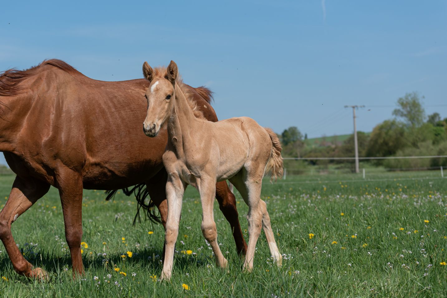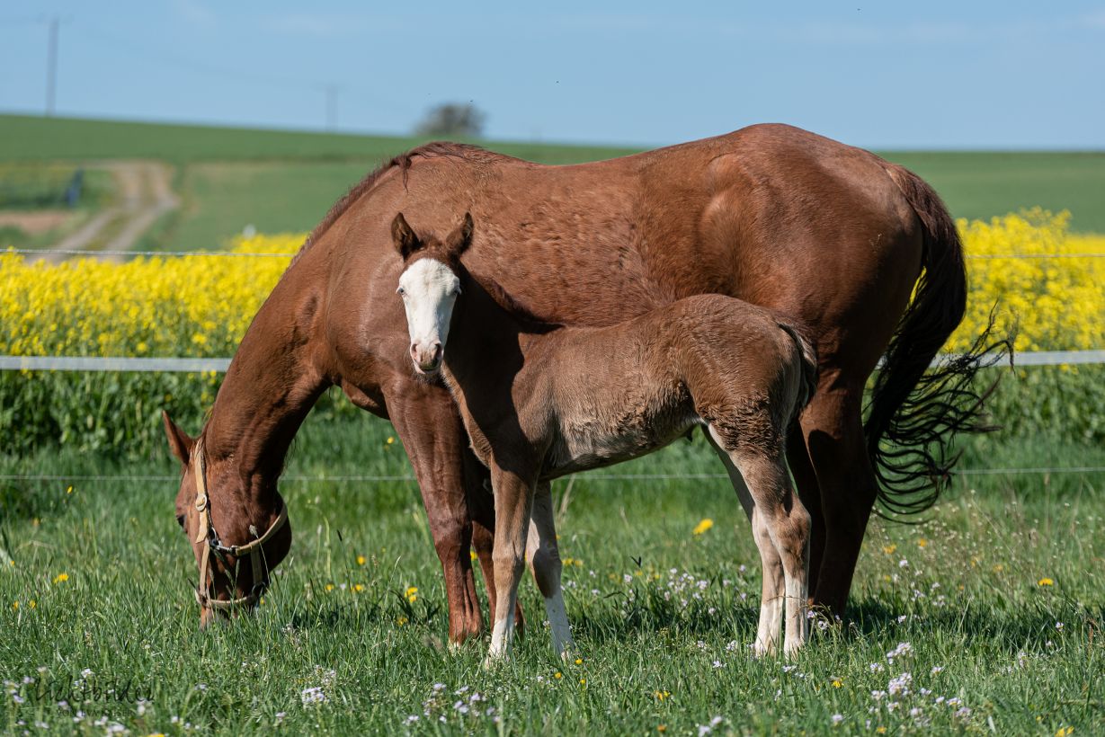 Tatatataaaaaaa… na, wer ist wohl der Urgroßvater dieses Quarterbabies? Wir nennen sie „Lenchen“ und sie ist eine richtige eigenwillige Lene… Mama Okie hat ihre Last, denn sie denkt an alles andere, nur nicht daran, Mama zu folgen. Die kleine Schönheit lässt mich jeden Tag strahlen. Ein Wunschkind – Quarterbaby mit 2 blauen Augen… Ihre Schwester Peppy letztes Jahr war auch ein Traum. Dieses Jahr heisst der Papa „Smokin Mifillena“ – hocherfolgreicher Hengst, der es bis zu den Weltreiterspielen geschafft hat.