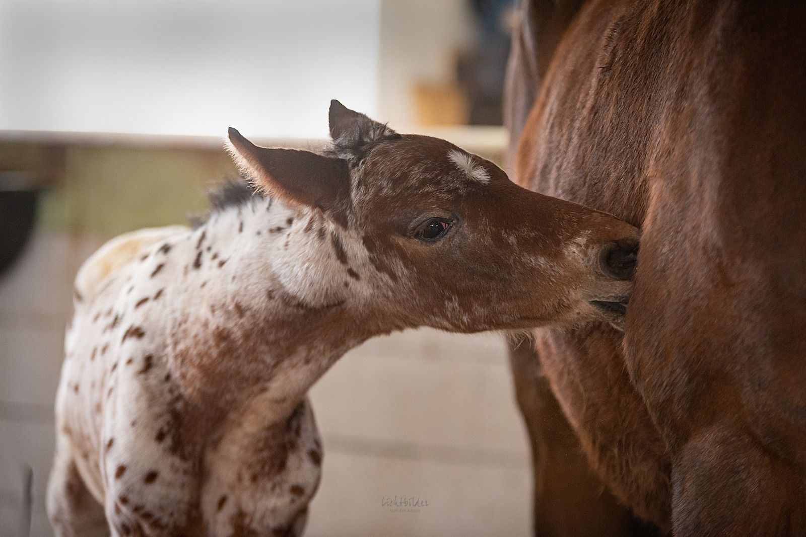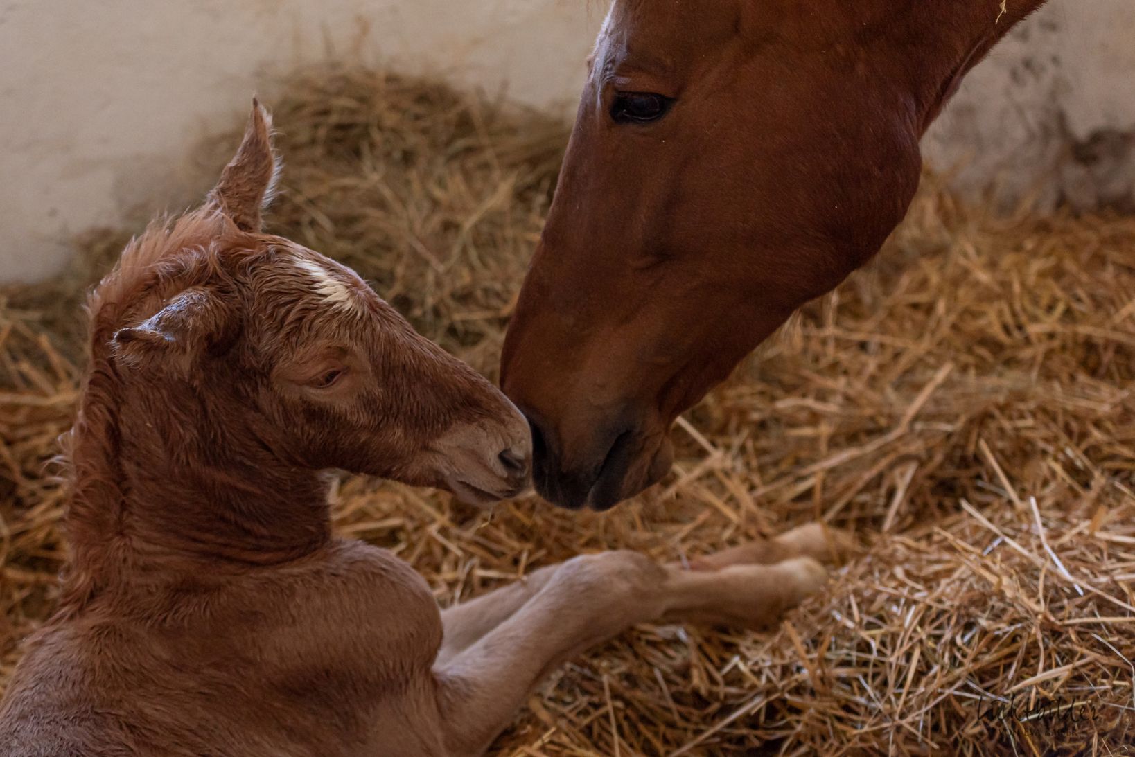 Da war die Patentante schneller mit der Bekanntgabe: Unser „Mini-Ludwig“! Ich kam vom Frühstück und dachte, ich seh‘ doppelt, denn er stand einfach so neben seiner Mutter. Merlin (der gute Hund) hat es gemerkt, ich wäre wohl an der Box vorbeigelaufen… ![]()