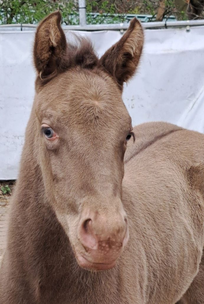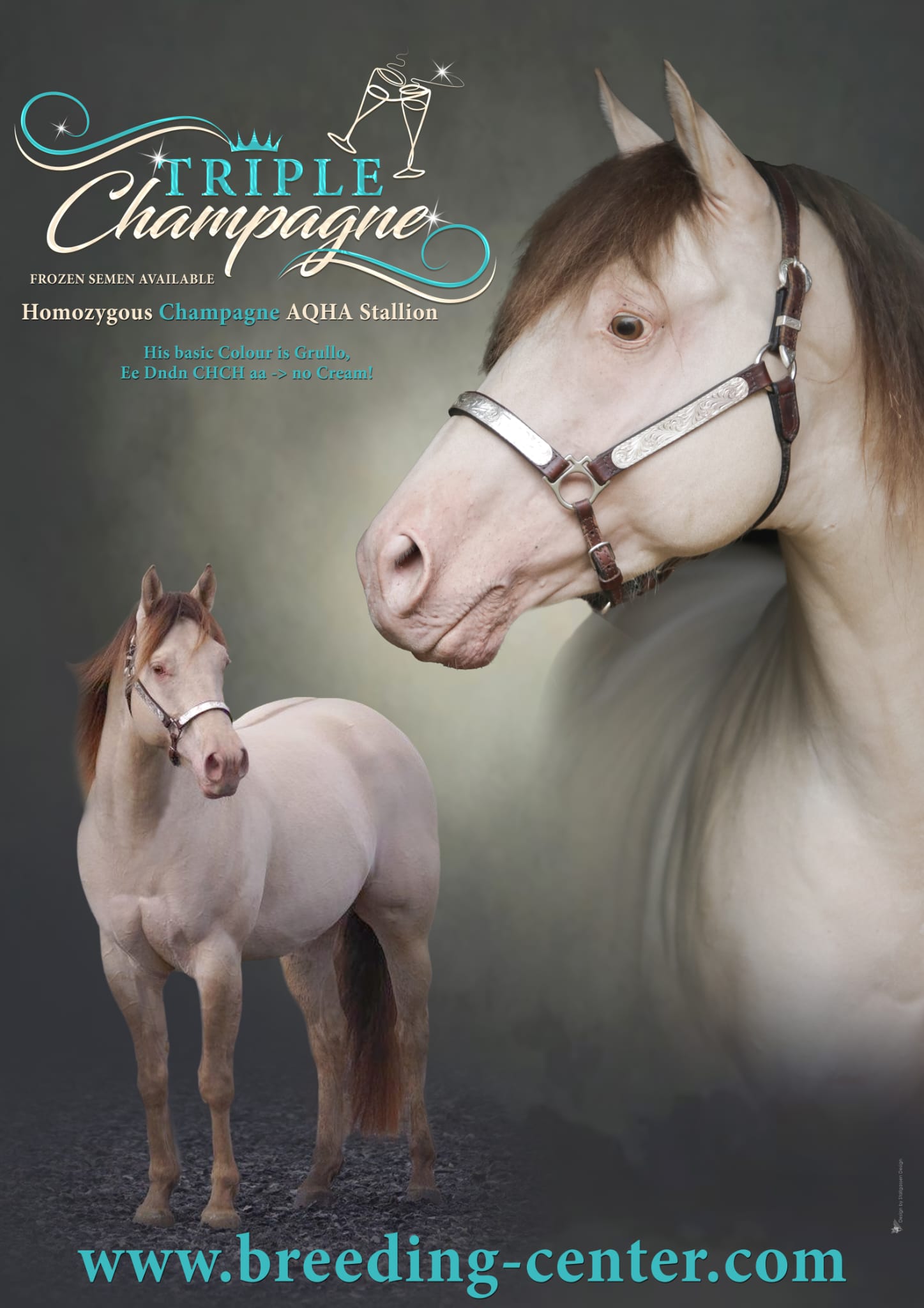 Triple Champagne ist ein außergewöhnlicher homozygoter Amber Champagne Quarter Horse Hengst aus Foundation-Zucht. Mit seiner markanten Sonderfarbe Champagne, die er zu 100% an alle Nachkommen weitergibt, kombiniert er beeindruckende Robustheit, Knochenstärke und ein harmonisches Gangbild – ideal für Cowhorse, Ranch Horse und Versatility-Disziplinen. Dieser kompakte, muskulöse und nervenstarke Hengst mit klarem Cowhorse/Ranchhorse-Typ zeigt keine Angst und ist immer zuverlässig im Job. Seine Basis aus starken Vorfahren sorgt für Langlebigkeit und Vielseitigkeit in Cutting, Reining und Ranch Riding. Der charmante Hengst überzeugt durch raumgreifende Bewegungen und ein supercooles Temperament. Seine gefrorenen Dosen ermöglichen internationale Zucht mit hoher Trächtigkeit – perfekt für Züchter, die Farbe, Typ und Performance wollen.